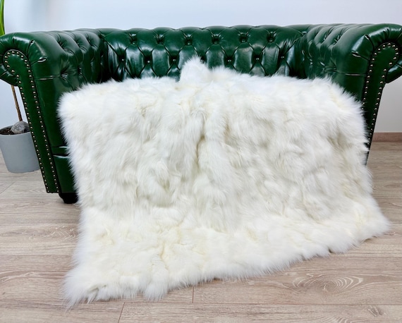 Handmade White Shadow Fox Fur Blanket: Luxury Bedspread Throw